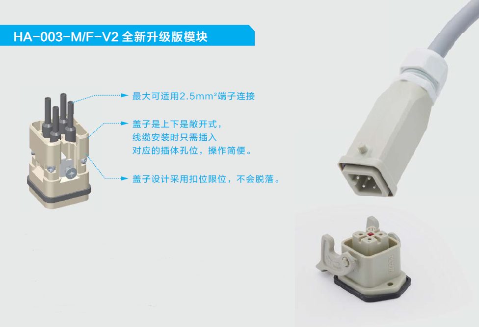 創(chuàng)新點:1. 在插體和外殼之間有蓋子阻隔,確保有足夠的爬電距離,保證可靠的電氣性能;2. 頂出線避免了側(cè)出線時導線需折成90°再往上;裝線時操作方便;3. 保護蓋子結(jié)構(gòu)可靠,上下推拉都不會脫落;4. 具有編碼銷功能,包含4種編碼方式。